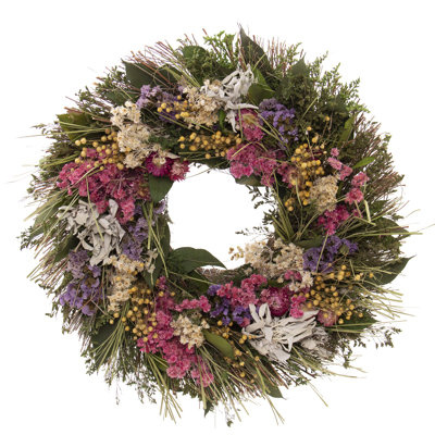 Create an accountThis a wreath just like you would find in your local farmer's market with a wonderfully curated mix of dried, straw, statice flowers, and sage over a blanket of eucalyptus leaves and grasses to create a magical spring feeling in this wreath.