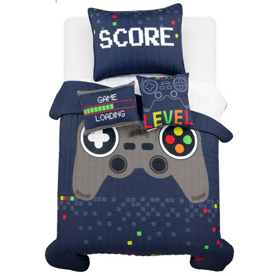 Create an accountDecorate your childs bedroom with the Video Games Reversible Quilt Set. Featuring a colorful pattern of old school video game designs and motifs on the front, with a small old school video game controller printed reverse. Get your little gamer to the next level with this video game bedroom decor. This kids bedding set includes 1 quilt, 1 or 2 shams, and 2 decorative pillows. Crafted from a soft microfiber fabric, offering softness and comfort. The medium-weight polyfill is perfect for any season. This toddler bedding is machine washable.