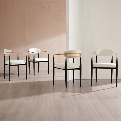 Create an accountOur exquisite 4-piece dining chair set, where luxury meets functionality. Upholstered in plush boucle, with elegant golden electroplated metal armrests and sleek black legs, these chairs exude a modern, sophisticated style. The sharp angles of the armrests add a contemporary flair, enhancing any dining space with a touch of opulence.