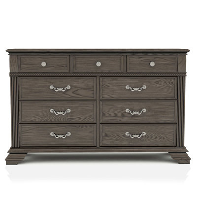 Create an accountThis 9-drawer double dresser elevates your bedroom or living room with a modern farmhouse look and extra storage. It's crafted from solid and engineered wood in a natural, neutral hue and a rectangular silhouette resting on bracket feet. The design features nine drawers in two different sizes great for organizing your wardrobe and accessories. We love the crown molding, picture frame paneling, and classic metal hardware pulls that complete the vintage-inspired vibe. A wall anchor is included for added safety.