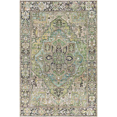 Create an accountThis Oriental rug features an intricate central medallion and dynamic floral motifs all over for a boho look we love. The Persian-inspired patterns come in distinctive ivory, green, and black tones with a slightly worn appearance. Machine-woven from stain-resistant polyester, this indoor area rug's 0.28" pile height gives you ample cushioning underfoot in living rooms, entryways, or dining areas. Even with a canvas backing, we think rolling it out over a rug pad is a smart idea.