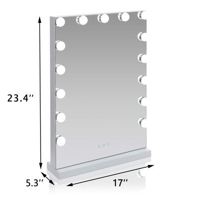 Create an accountThis large light-up mirror adds plenty of illumination and a glam aesthetic to your space. The reflective glass panel has a horizontally rectangular shape, and it features built-in, globe LED bulbs around the edge that give it a backstage Hollywood feel. It plugs into a traditional socket and has an on/off switch on the side. We love that this mirror has magnifying capabilities that are great for doing hair and makeup. It measures 32'' wide and 23'' wide, so it's a great size for a bigger vanity desk or dresser. It can be wall-mounted, or it can be freestanding.