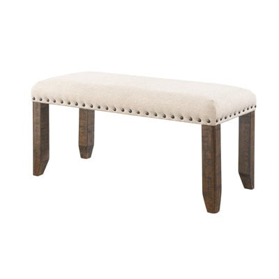 Create an accountThis upholstered bench elevates your hallway or bedroom with a sleek mix of materials. It's crafted from solid and engineered wood with a brown acacia veneer that looks natural and rustic with organic grain color variation. The bench is upholstered in a linen-like polyester in a soft cream tone that goes with almost any color palette. We love the details that make this 2-person bench special: Tapered feet and metal nailhead trim complete the tailored look.