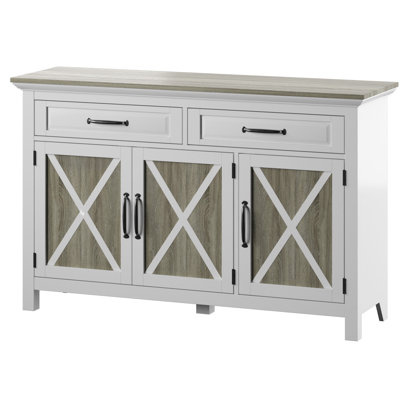 Create an accountThis charming 2-drawer sideboard adds a simple country-inspired touch to your living room, kitchen, or dining room. It's crafted from engineered wood and boasts a two-tone design that plays up the style of your modern farmhouse decor. Three cabinet doors open up to reveal two separate storage areas with one adjustable shelf that can store away extra dishes, wine bottles, and books. Its two drawers are ideal for silverware, placemats, and other personal items. This sideboard doesn’t only transform dining spaces though – set it up in your living room as a TV stand that can hold any TV up to 55" and 185 pounds.