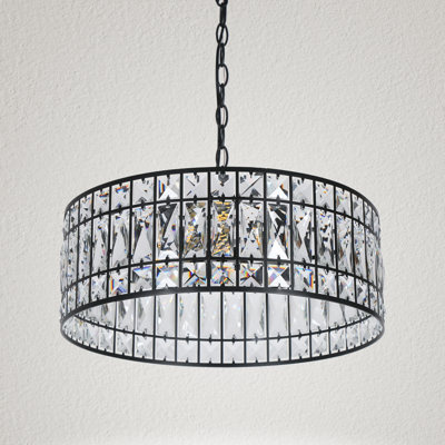 Create an accountThis 3-light drum chandelier brings a glamorous edge to your space with its sleek matte black frame and faceted crystal panels. The crystals refract light beautifully, creating a sparkling ambiance in any room. A height-adjustable chain allows for versatile hanging options, making it suitable for various ceiling types, including sloped ceilings. Compatible with dimmer switches, this fixture lets you set the perfect mood. Ideal for dining rooms, entryways, or bedrooms, it combines modern design with timeless elegance.