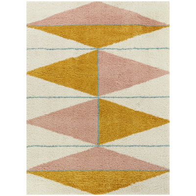 Create an accountThis shag area rug has a contemporary look with a plush feel that creates a modern and luxe foundation for your room. It's power-loomed in Belgium from polypropylene that's stain-resistant and safe for heated floors. The rug features dual-tone diamond large-scale diamond shapes in pink and golden with blue lines spread out on an off-white background. This area rug has a high pile height of 1.18'' which makes it perfect in bedrooms and living rooms for a cozy feel. Make sure to pick up a rug pad to keep it in place underfoot.