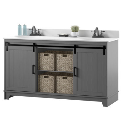Create an accountThis 60" double bathroom vanity set brings a coastal farmhouse look to your guest bath or half bath with its slatted design and breezy wicker baskets. Its freestanding frame is made from engineered wood in a neutral hue that complements any color palette. The vitreous china surface has a crisp white finish that accommodates the included oval drop-in polymarble sink. Its two cabinet doors have slatted details and sleek, matte black bar handles that roll open on a metal track for a rustic look, revealing tons of shelf space for toiletries and towels. Plus, we love that the four rattan baskets in the middle of this vanity set provide just enough room for jewelry, makeup, and hair products. This vanity arrives fully assembled.