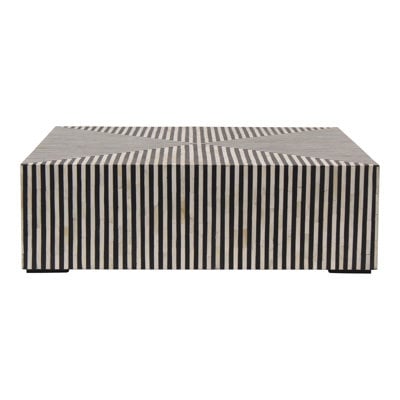 Create an accountSimplistic and bold, this coffee table's hypnotic art deco design is an exercise in contrasts. A veneer of ethically sourced white and black camel bone with resin adds a visual statement that contrasts with its simple construction and square shape. This series features a coffee table and a side table to better suit living spaces of all sizes and shapes.