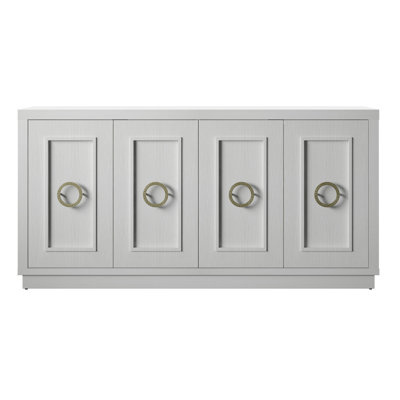 Create an accountThis versatile credenza is fashioned with round, gold-finished handles and inset paneling for the right Art Deco look in your living room or dining room. The clean-lined frame is made from engineered wood with a neutral finish, and it rests on a plinth-style base. Four cabinet doors open to reveal adjustable shelf space for dishes, media items, and wine glasses. This credenza has a 64" wide surface that easily accommodates trays of appetizers and a table lamp. Plus, cable management in the back helps to tame those pesky wires.