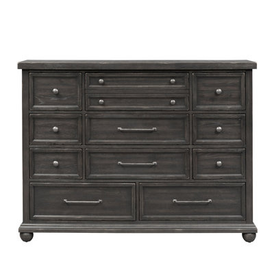 Create an accountThis 11-drawer chest has rustic style and plenty of storage – all it needs is your home to make it complete. It's made of solid and engineered rubberwood with a black stain and straightforward moldings like recessed moldings. This dresser is finished with a scoring and rub-through treatment and handmade wormholes for a lived-in feel. It has a generous 11 dovetailed drawers that open easily on smooth metal ball bearings to give you easy access to folded shirts, while felt-lined drawers protect your delicates. Best of all, this dresser comes fully assembled with wall-anchoring safety hardware.