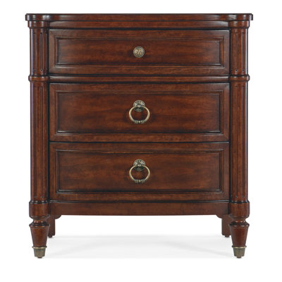 Create an accountThe vintage charm of the coastal South meets the traditional soul of the Federal and Georgian design period with the Charleston Three-Drawer Nightstand. Featuring 3 self-closing drawers with cherry- colored interiors and two USB port chargers and a cord clip on the back, the nightstand is adorned with fluted pilasters and metal ferrules on the feet. Crafted of Cherry and Maple Veneers with a Solid-Wood edge top, it is finished in Black Cherry patina with subtle distressing. The round knob and ring pulls have an antique bronze finish.