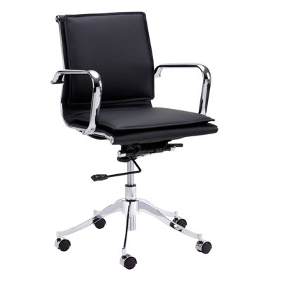 Sleek and streamlined, this office chair has an ergonomic design that looks right at home in modern-style spaces. It features a stainless steel frame and armrests, all silver-finished for a contemporary touch. Faux leather upholstery in a solid tone adds a vintage look to the piece, while channel tufting gives it even more dimension. Five double caster wheels allow you to move around from task to task with ease. Plus, it showcases a height-adjustable seat, tilt mechanism, and swivel function to meet your home office needs.