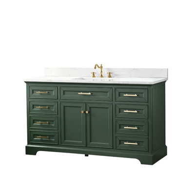 Create an accountThis single-bathroom vanity set features clean lines and plenty of drawer space for all your makeup, toiletries, and cleaning supplies. Its wide 60" design is made from solid and manufactured wood in a neutral finish, and its surface is crafted from engineered stone in a Carrara white finish that complements your contemporary decor. The included undermount sink is made from ceramic, and it boasts a rectangular silhouette. Eight indented drawer fronts come with handles and they open up to reveal space for washcloths, toothpaste, and hair ties. And the two matching doors with rounded knobs hide extra shelf space for hairdryers and bath towels. Plus, this bathroom vanity comes with a backsplash to help protect your walls.