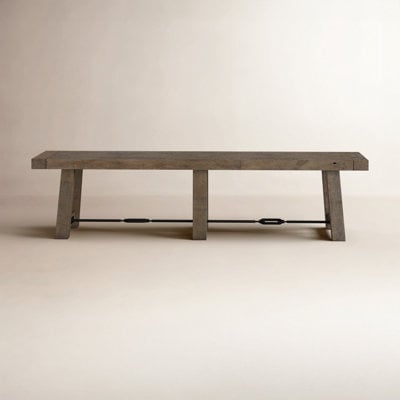 Create an accountFull of farmhouse character and individuality, this dining bench brings a warm, handcrafted look to your eating space. Made from solid pine wood, it comes in a neutral finish that highlights variations, knots, and grains on its surfaces to show off a piece rich in detail and natural beauty. Metal turnbuckle accents provide extra stability as they connect the angled, tapered legs. There's plenty of space to seat three people in your dining room or eat-in kitchen.