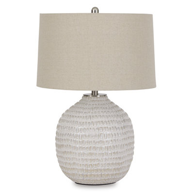 Create an accountThis table lamp features a rounded silhouette and a textured surface to bring coastal farmhouse charm into your living room or bedroom. It showcases a ceramic base in a beige hue, with an embossed rectangular pattern across the entire surface. The fixture is topped off with an off-white fabric drum shade that's ever-so-slightly tapered. This shade tempers the light from a 150W bulb (sold separately). This 26" lamp is also compatible with LED bulbs, to bring long-lasting warmth and light whenever you need it. Style and function come together in this textured ceramic lamp to bring incandescent style to any space in your home. Combining a rounded base, accented with goldtone hardware, this lamp is capped off with a simple natural lampshade for complete elegance. Pair with a wide variety of furniture styles for a versatile indoor lighting option you'll love.