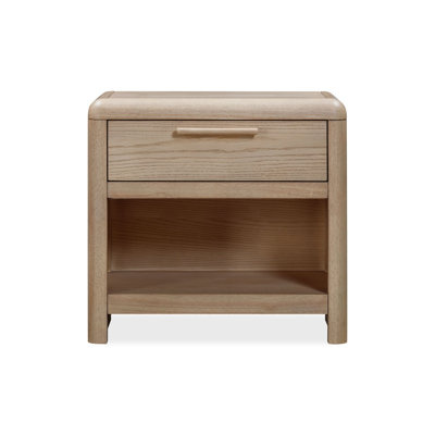 Create an accountThis nightstand features rounded corners, a cylindrical wood drawer pull, and a wire-brushed tan finish that highlights its soft, organic look. Made from ash veneer over rubberwood, it includes a single drawer and an open lower shelf for both concealed and display storage. A built-in cord cutout inside the drawer helps keep charging cables neatly tucked away. Fully assembled and easy to place, it brings calm function to any bedside setup. We love that its streamlined form feels both modern and timeless.