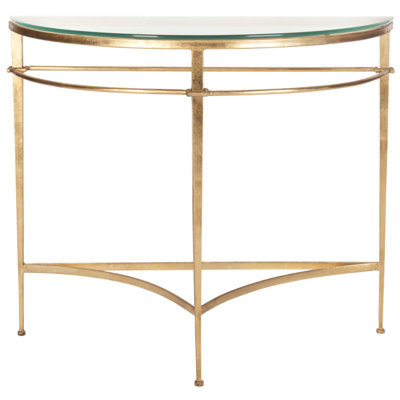 Create an accountThis console table has an open frame and a glam mix of materials that add style and storage to your living room or bedroom. Its half-moon frame is made from metal with a sleek gold finish, and it features circular cut-out designs around the top and legs for a touch of mid-century design. This table has a thin surface made of tempered glass, so it's easy to clean and has plenty of space for your house keys or a vase of fresh flowers. Plus, it arrives fully assembled.