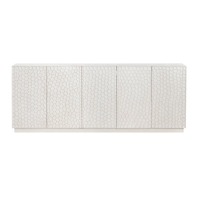 Create an accountSubtle glamour, major storage. Hundreds of hand‑set resin “shell” tiles create a scalloped texture that shimmers softly across this 84‑inch media cabinet. Push‑latch doors conceal adjustable shelves, center soundbar space and rear cord exits.