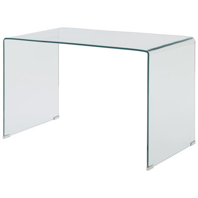 Create an accountElevate your workspace with this ultra-modern glass writing desk, designed for a sleek and minimalist aesthetic. Crafted from a single piece of clear tempered bent glass, this desk boasts a seamless, fluid design that adds a contemporary touch to any home or office. The spacious tabletop provides ample room for a widescreen monitor, lamp, or essential workspace items. Chrome-finished metal floor protectors ensure stability while preserving your flooring. Whether placed in a high-rise office with a city view or a serene home setting, this glass desk makes a sophisticated statement.