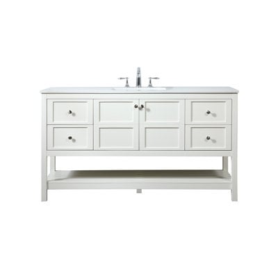 Create an accountThis freestanding single vanity set provides a spot in larger bathrooms to get ready for the day or finish your before-bed routine. It has a clean-lined solid and engineered wood base with a crisp, neutral finish for a breezy, coastal vibe we love. Four functional drawers and a central cabinet with double doors give you ample space to store toiletries and other bathroom essentials. An open slatted shelf underneath is just the spot to keep freshly laundered towels. The white quartz countertop stretches 60" wide, and it includes a rectangular ceramic undermount sink. A faucet is sold separately.