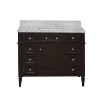 Create an accountThis single bathroom vanity set is a surefire way to get a traditional look in your bathroom. Its base is made from solid wood, and features molded pilasters, framed drawer fonts, and tapered spade feet for a classic feel. The base is available in a variety of solid finishes so you can get just the right look. This vanity also comes with a white Carrara marble countertop, which has three pre-drilled holes for a faucet of your choice and a rectangular ceramic undermount sink. A total of three drawers and two shelves give you room to stash you and your family's most-used toiletries and supplies.