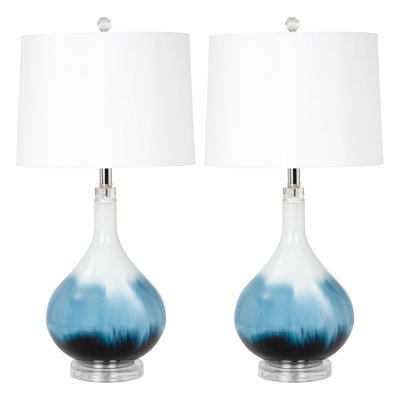 Create an accountTransform your living space into a serene coastal retreat with the Ombre 28-Inch Blue Glass Table Lamps. Crafted with exquisite blue glass bases and topped with classic linen shades, these lamps bring a touch of ocean-inspired tranquility to any room. The 3-way switch offers versatile lighting options,soft ambient glow to bright task illumination, catering to your family's needs. Standing at 28 inches tall and 14 inches wide, they serve as elegant focal points for living rooms, bedrooms, or beach-inspired retreats. This set of two ensures balanced style and harmonious illumination, making them perfect for coastal living room furniture or family-friendly lighting solutions. Designed with quality craftsmanship, these lamps combine timeless aesthetics and modern functionality to transform your décor with soft, inviting light and a touch of ocean-inspired tranquility.