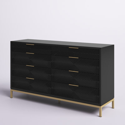 Create an accountThis glam dresser combines functionality and sophistication, featuring a dynamic front design that adds a touch of elegance to your bedroom. Crafted from engineered wood and finished in a sleek black hue, this dresser offers eight spacious drawers with soft-close mechanisms and dovetail joints for lasting durability. The brushed brass handles and metal base with straight legs bring a modern twist to the traditional design. Inside, you'll find lined interiors and modular drawer dividers to help organize your clothing and accessories. For added safety, a tipover restraint device and wall anchor are included. Complete your bedroom ensemble by pairing this dresser with other glam-inspired pieces.