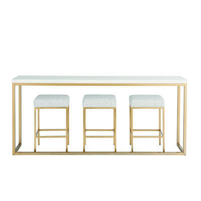 Create an accountThis console table and home bar set elevate your space with a mix of glam materials. It includes one bar table and three backless, armless stools. The table design features a steel base in a gold hue with a modern, streamlined construction supporting a white alabaster surface. We love that the three matching stool designs have sled legs with built-in footrests topped with upholstered cushion padding. Our favorite? This set comes completely ready to go with no assembly meeting.