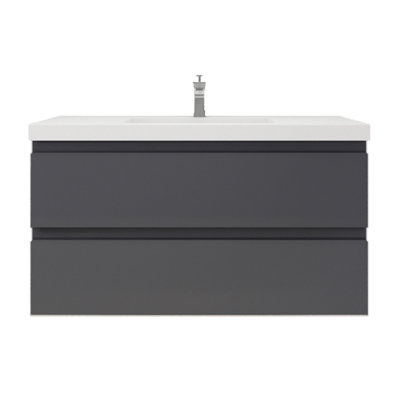 Create an accountThis 42'' single-mounted vanity adds a modern style to your main or guest bathroom. Crafted with engineered wood, it features a white acrylic top with a rectangular undermount sink. Two soft-close drawers let you keep toiletries and bathroom essentials close at hand, with safety stops to keep your fingers from getting caught. Plus, it's wall-mounted, so your floor can hold storage baskets for extra towels and toilet paper. A pre-drilled hole in the top makes adding hardware (sold separately) easy. Best of all, this vanity arrives fully assembled and ready to install.