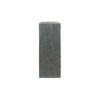 Create an accountSleek minimalism. This modern dresser combines solid acacia wood construction with a sleek, dark gray finish and brass handles for a stylish storage solution. It features five spacious drawers, providing ample room for your clothing and accessories. The top drawers are designed not to extend all the way out, preventing tipping for added safety. With a finished back, this vertical standard dresser can be placed anywhere in your bedroom, making it a versatile addition to your space. The tip over restraint device is included for extra security. Enjoy the natural luxury of this dresser that's both functional and visually appealing.