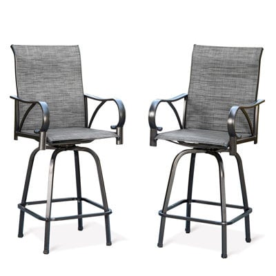 Create an accountMake the most of your patio bar or breakfast table with this 2-piece set of 29'' bar stools. Crafted from a powder-coated steel frame, it features a high back and scrolled arms balanced on a base that lets you swivel 360 degrees. The square seat and back show off a dark gray fabric that's stretched across the frame for a light, airy feel. We love that the base comes with a footrest, letting you enjoy your brunch or evening beverage in comfort. Plus, it resists water, UV rays, mildew, and stains, so it's a great fit for outdoor spaces.