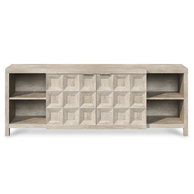 Create an accountThe Prado entertainment credenza offers architectural beauty with a coffered center section that has two soft-close doors. On either side is open shelving, each with one adjustable and removable shelf. Behind the center doors are adjustable and removable shelves, with the entire credenza finished in Tawny.