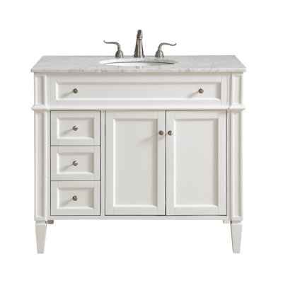 This freestanding single vanity makes a splash in your bathroom with its clean lines and traditional accent paneling. It has a solid and engineered wood base that rests on tapered legs and features a rustic brown finish that brings out a noticeable wood grain. Three drawers and a cabinet with two double doors provide space to tuck away towels, toiletries, and other bathroom essentials. This vanity has a Carrara marble countertop that measures 40" wide, and it includes a white, oval ceramic under-mount sink (faucet sold separately). There's also a convenient open back panel for hassle-free installation access.