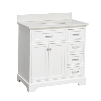 Create an accountThis Eliason 36" single bathroom vanity set includes a cabinet with soft close doors and drawers, a marble countertop with stunning double-thick beveled countertop edges, and an undermount ceramic sink. All 36" single bathroom vanity set comes with countertop and sinks pre-installed. No two slabs of marble/quartz are the same! This is 100% authentic marble/quartz imported from Italy. Many competing models are advertised as solid wood when in fact only the structural frame of the cabinet is made of solid wood, and the doors, drawers, and other panels are made of plywood. The frame, doors, and drawers are 100% solid pine wood! Natural finish drawer interiors so that you can see exactly what it's made of.
