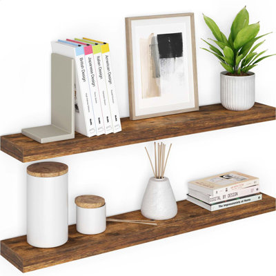 Create an accountThis set includes 2 shelves, each almost 3 feet long and 6" deep, allowing you to create an attractive gallery-style wall display in your home. These sleek and stylish floating wall shelves not only enhance your decor but will allow you to utilize wall storage space and display your beloved items in creative and attractive ways. Showcase your favorite album records, wall art, books, magazines, or picture frames. Use these wide shelves as a floating bookshelf, small toy organizer, photo ledge, towel shelf, or kitchen spice rack to organize your bottles and jars. These shelves are great for your bathroom, bedroom, kitchen, living room, dining room, playroom, kids’ room, nursery, storage room and more.