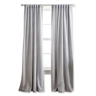 Embrace beach cottage charm with the Martha Stewart Ticking Stripe Curtain Panel. With a soft wash of color, this panel set reflects seaside hues into your space. A slim stripe print gives this panel pair a clean and bright impression that will touch any room with a splash of fashion. As it fills the home with its understated beauty, it will also keep out unwanted sources of light, heat, and cold air. The polyester blackout lining offers privacy and comfort in your home. Welcome in natural light when you want to with this set. The poly-cotton blend lends a soft hand feel and a long-lasting, durable design. Keep this set in a clean and crisp condition by placing it in a machine wash as needed. To embrace this style, hang this set of two-rod pockets or back tabs on a standard curtain rod of your choice.