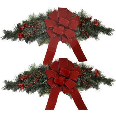 Create an accountCelebrate the holidays with The Holiday Aisle's gorgeous window swags. Use these lush pine swags on the inside or outside of your home. Embellished with pine cones, red berries and a red velvet ribbon.