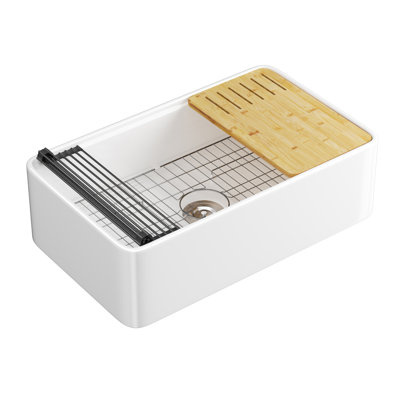 Create an accountThe timeless design blended with convenience and functionality, Eridanus puts a modern twist on the classic farmhouse kitchen sink. This model is made from fine fireclay material that offers the sink unparalleled resistance to stains, scratches, and chips. And the non-porous, high-gloss finish crafted using advanced glazing technology cleans very easily and maintenance is relatively simple. As with any farmhouse sink, our sink provides sufficient space for stacking dishes, filling pots, and preparing meals to best meet the needs of a busy kitchen. Moreover, this workstation sink is designed with an integrated ledge for sliding accessories, allowing you to work directly over the sink, and so you can save valuable counter space and streamline everything from meal prep to cleanup. As a perfect union of aesthetics and utility, the sink will undoubtedly become a statement piece in your kitchen. This sink comes with accessories including a basket strainer, a protective bottom grid, a cutting board, and a foldable drying rack.